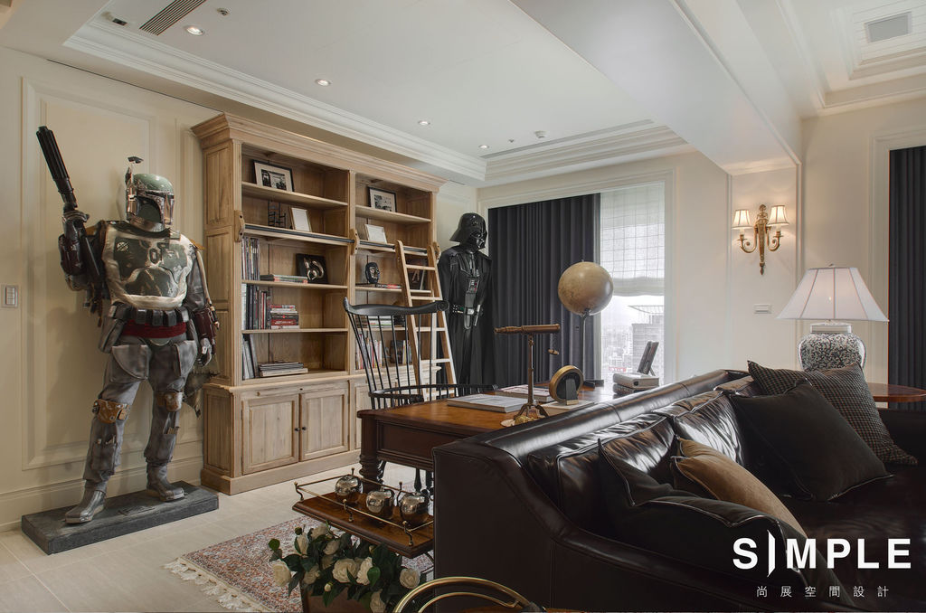 被黑武士鎮守住的書牆,一定是反攻銀河帝國的神祕典籍吧 ! 古典書桌椅沉穩地座落在客廳的末端,搭載桌上的望眼鏡與地球儀,坐在這裡,掌握宇宙的脈動。