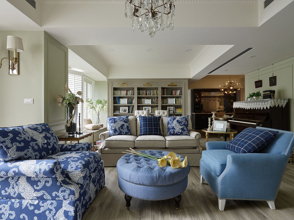 青花瓷元素甚至能擴展到家具設計上,比如設計成沙發,從素雅的綠意背景中跳脫出來。