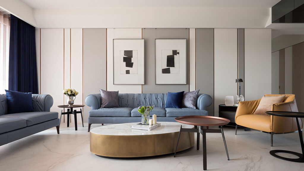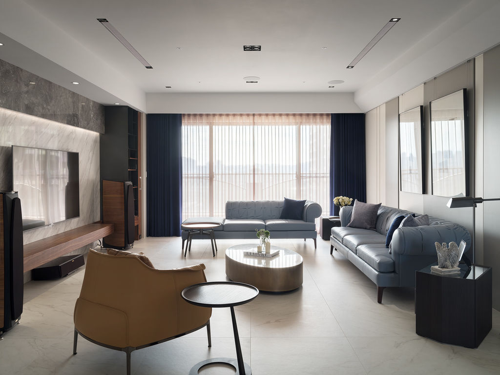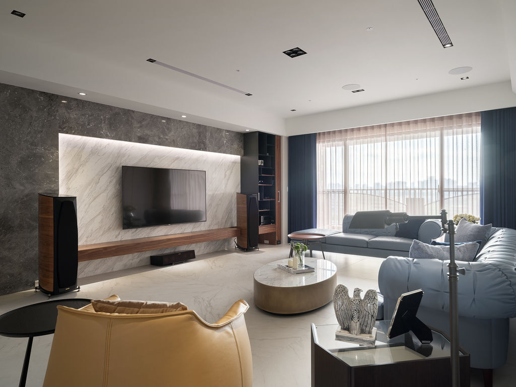 相同的元素延伸進客廳,俐落的線板與簡潔的大理石電視牆相對應,挑選的家具呈現冷暖對比,創造出具有親和力的品味空間。 大器切割的大理石電視牆,塑造出恢弘的劇院感。