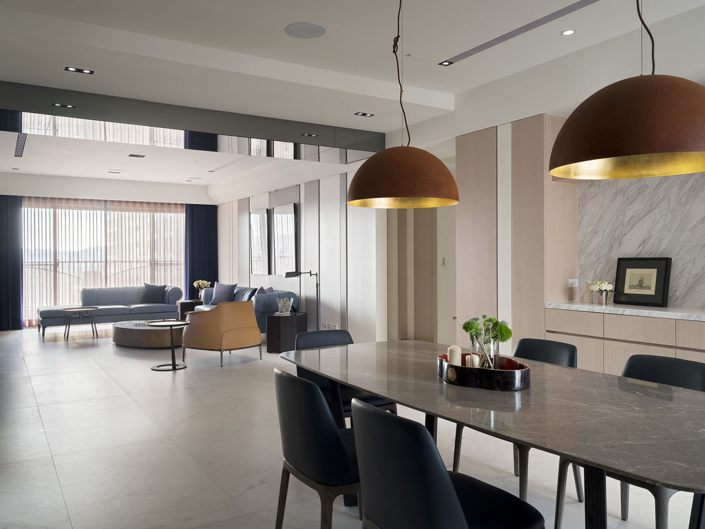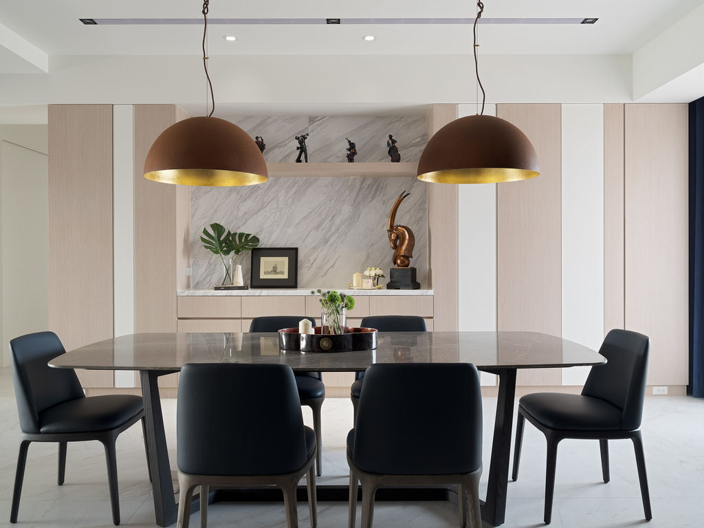 時尚+溫度,處處在同一空間中交織,正是溫暖現代風迷人之處,工整的高科技酒櫃鑲嵌在深色訂製櫃中,古銅雙餐燈溫暖了一家人的好胃口。