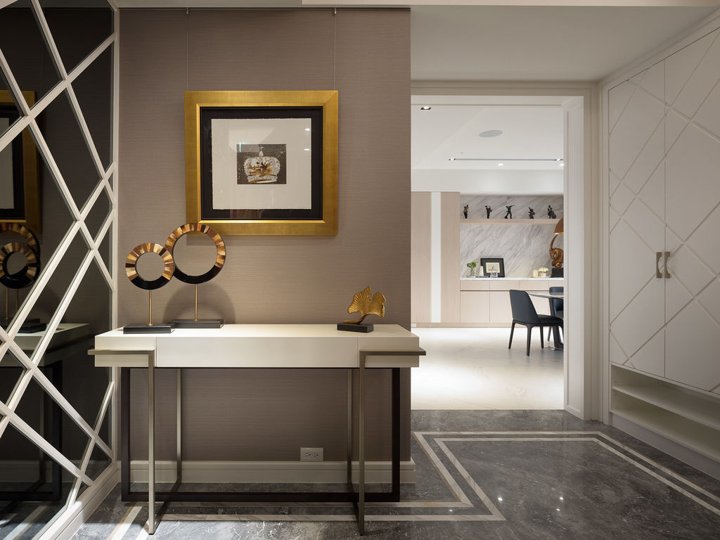 從玄關開始,就能看出設計的主軸-簡約的幾何與線條元素,搭配精選的古銅金黃燈飾與畫框,營造出現代美式的時尚視野。