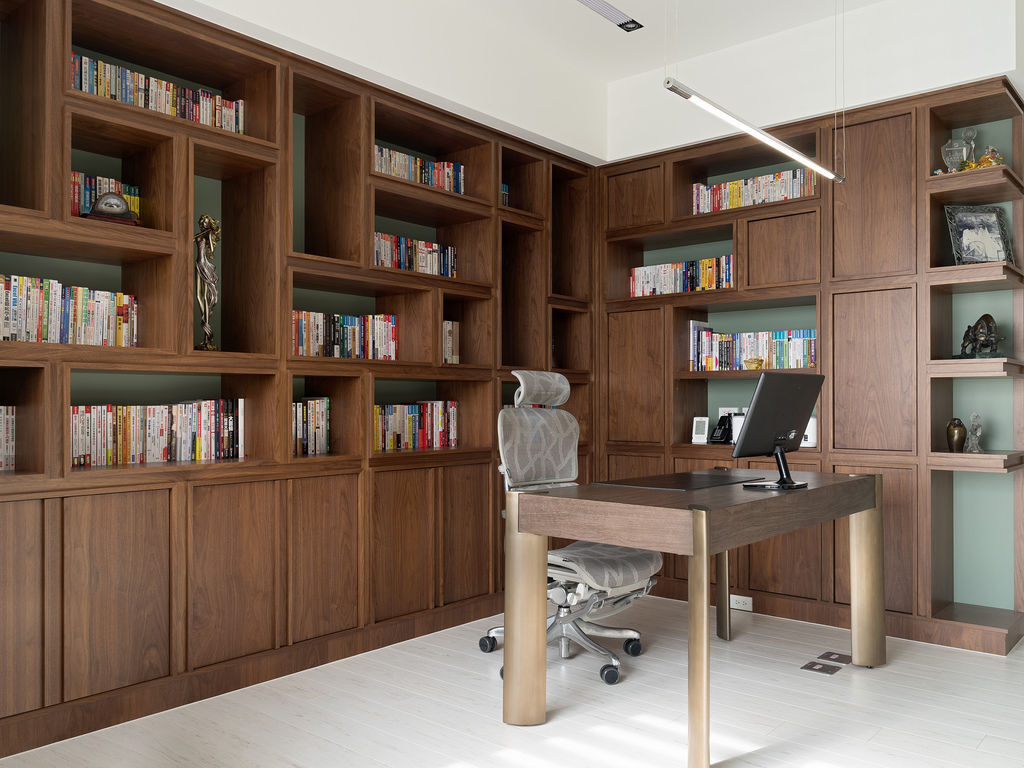 在客廳的正後方,工作書房的設計重點在於如何美觀的展示藏書、工具書、藝術收藏品,並預留未來還會新增藏書的數量,規劃了不同尺寸的木作層架書牆,部份開放式,部份製作門片。