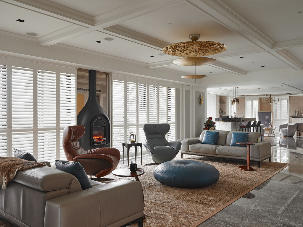 左右翼規劃出生活機能,透過電視牆畫出廊道動線,切割鋪排出雙動線。空間左翼安排主臥室、女兒房,在台灣難得能看見的北歐式壁爐成為中央聚焦點,並藉由沙發與單椅的位置呈現美好的對話情境,同時選搭家具、家飾展現主人的品味,營造出當代摩登的Living Room場景。