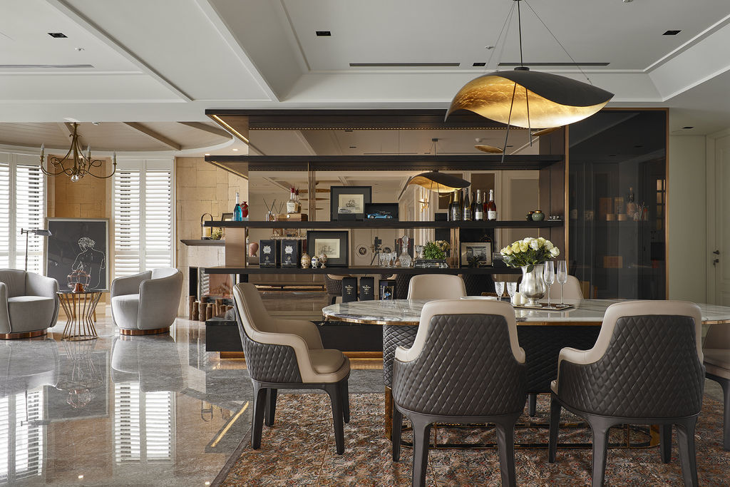 而空間的右翼則呈現出高質感的私人Club風情,極具奢華感的餐廳區域,綴點霧金色元素、剔透鏡面帶出精緻感,六人座餐桌,襯佐花色地毯,營造齊聚一堂的餐敘時光,在這個近百坪的大宅中,交流不僅限於客廳而以,在餐廳或各角落都能產生相聚的可能。