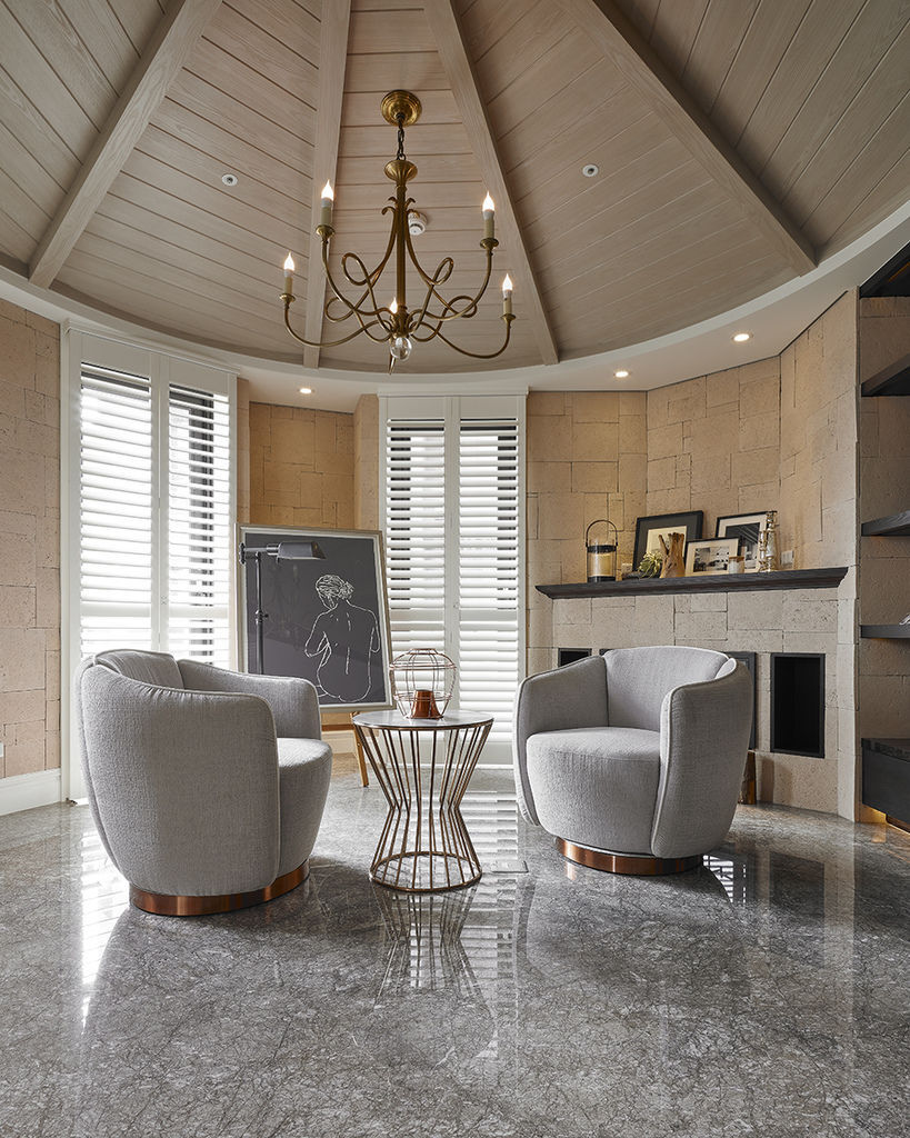 除了大客廳之外,另外也依循著結構柱與空間架構,在採光極佳之處安排小偏廳,採以木質挑高圓屋頂設計,並納入良好自然光,猶如一處小型度假空間;旁側更緊連吧檯,隨時可展開對話互動,偏廳內則配置電子小壁爐,並安置畫架,未來也規劃做為女主人的專屬畫室,在斜落的日光下捕捉稍縱即逝的靈感。