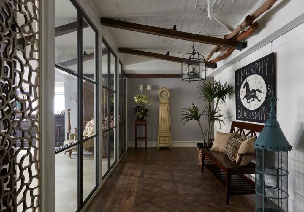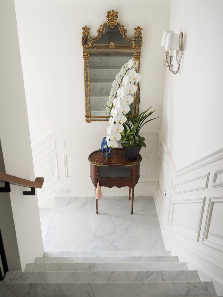 挑高的階梯,巧妙的擺設了古典獸足櫃,古銅鏡,配上比例修長的花卉,讓原來容易被走過錯過的階梯角落,成為典雅演出的副舞台。