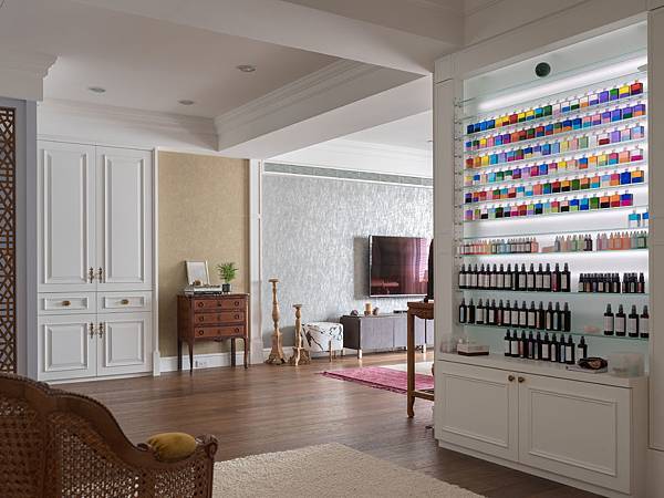 「憑直覺選擇一支色彩搭配的精油,來分析你最近的情緒與內心。」女主人解說牆上展示櫃英國精油的作用。