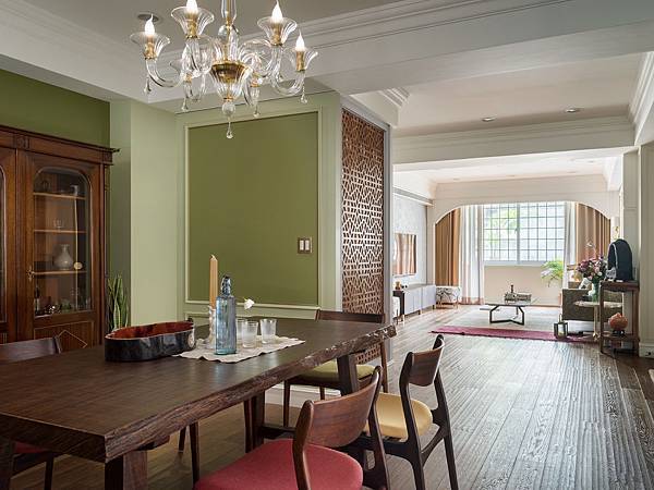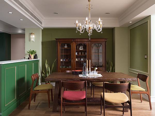 搭配同款不同色的餐椅,中間的杯盤櫃則回歸原木質感,平衡用餐場域的豐富色調。