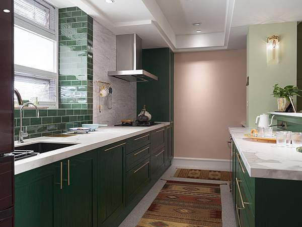 與交誼廳相望的廚房用餐區域,屋主則將個人喜愛的綠色,發揮了不同的層次,壁面的淺橄欖綠舒緩用餐氣氛,吧檯與廚具則大膽選擇少見的深綠與艷綠