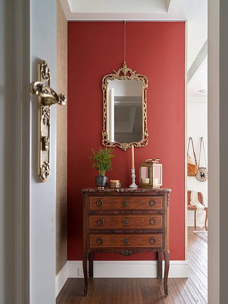 穿越客廳來到臥室,一定會被入口的硃砂紅壁面驚艷到,金屬的東方風情掛鏡點綴其中。