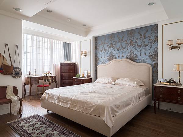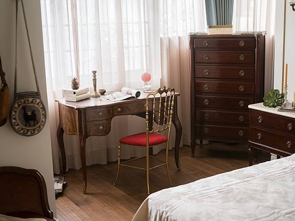 進入臥室空間重現南洋殖民風,古典書桌與床邊櫃,玲瓏的線條重現了上世紀印度殖民時期的慢活生活。