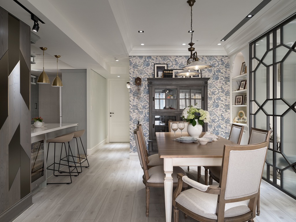 ▲客餐廳的串聯,使客廳功能得以延伸,大片木百葉篩進柔和日光,讓開放空間更顯敞亮開闊,搭配客廳的斜頂天花,挹注了美式休閒氛圍,佐以客餐廳的別緻吊燈,讓場域流露細膩神情。