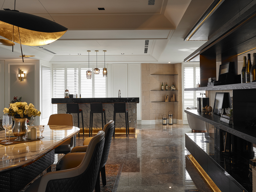 ▲有著大坪數優勢的居家空間,吳啟民總監為其規劃了咖啡館般的吧台,連接著餐廚區的則是起居沙發區,不論是用餐後或下午茶時光,都能在此區悠閒地度過。設計運用金色線板勾勒出擅長的美式輪廓,與大面古典銅鏡、棉花糖般輕柔的天花造型,交織出女主人的專屬氣勢。