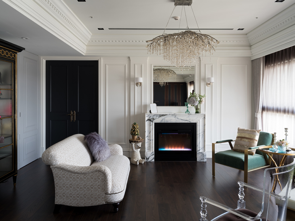 ▲緊臨著客廳的是設置壁爐的起居空間,運用鏡面、水晶吊燈以及古典線條,圍塑出輕奢時尚的休憩一角,藉由空間的切換,也轉換出與家人、訪客互動的不同心境。