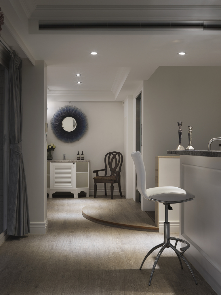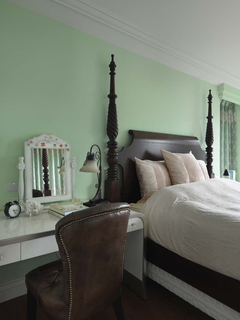 樓上臥室區,同樣導入自然光,但更重視隱蔽,柔和綠搭配美式淺色線板,寧靜的現代古典氛圍,讓業主一家在臥室區安靜渡過夜晚的休息時間。