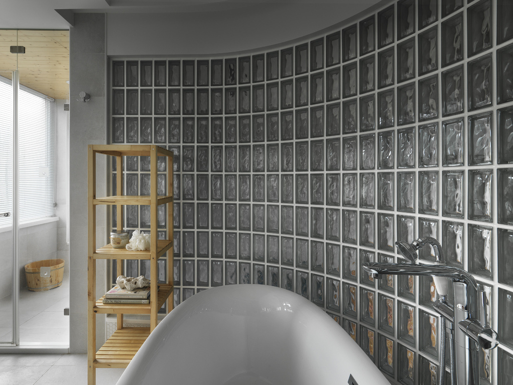 建築主體的圓弧型,是很好的改造點,利用圓弧牆面,搭配半透光霧玻璃,就誕生了這間比美國外豪宅的圓弧型衛浴空間。