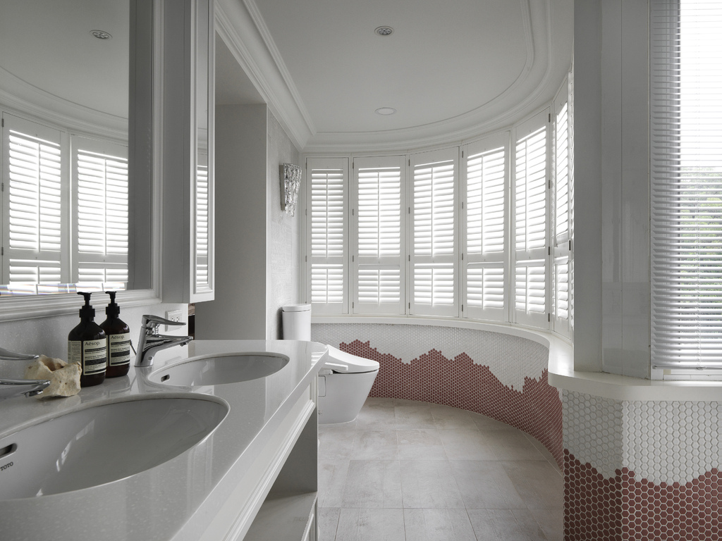 防潮木百葉搭配異國風馬賽克磁磚,在台灣擁有美式圓弧浴室,並非不可能的夢想。